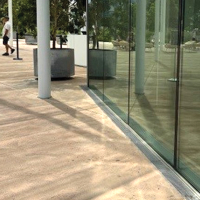 A key design consideration was to protect the building from rainwater around the single-level pavement between the North and South Buildings. A shallow drainage system with multiple outlets was needed to fit within the limited screed depth to prevent ponding. Pedestrian safety was also essential, with a focus on wheelchair accessibility and slip resistance.